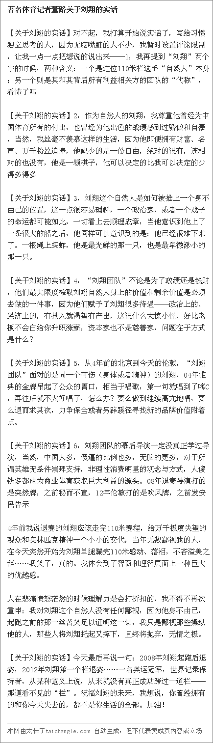 冉云飞@ranyunfei 著名体育记者董路关于刘翔的实话和8月4日出现的关于刘翔退出姿势的精准预言,合起来看,你就会更加懂得肮脏的国家主义和复杂的经济利益共谋的中国体育政治经济学了。